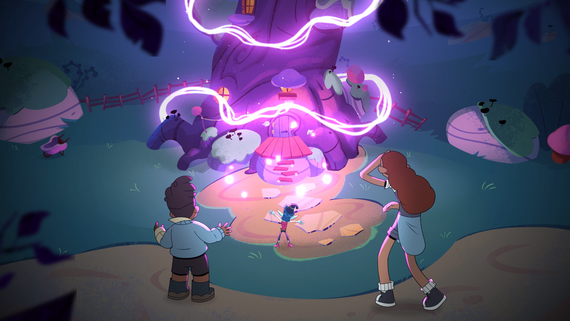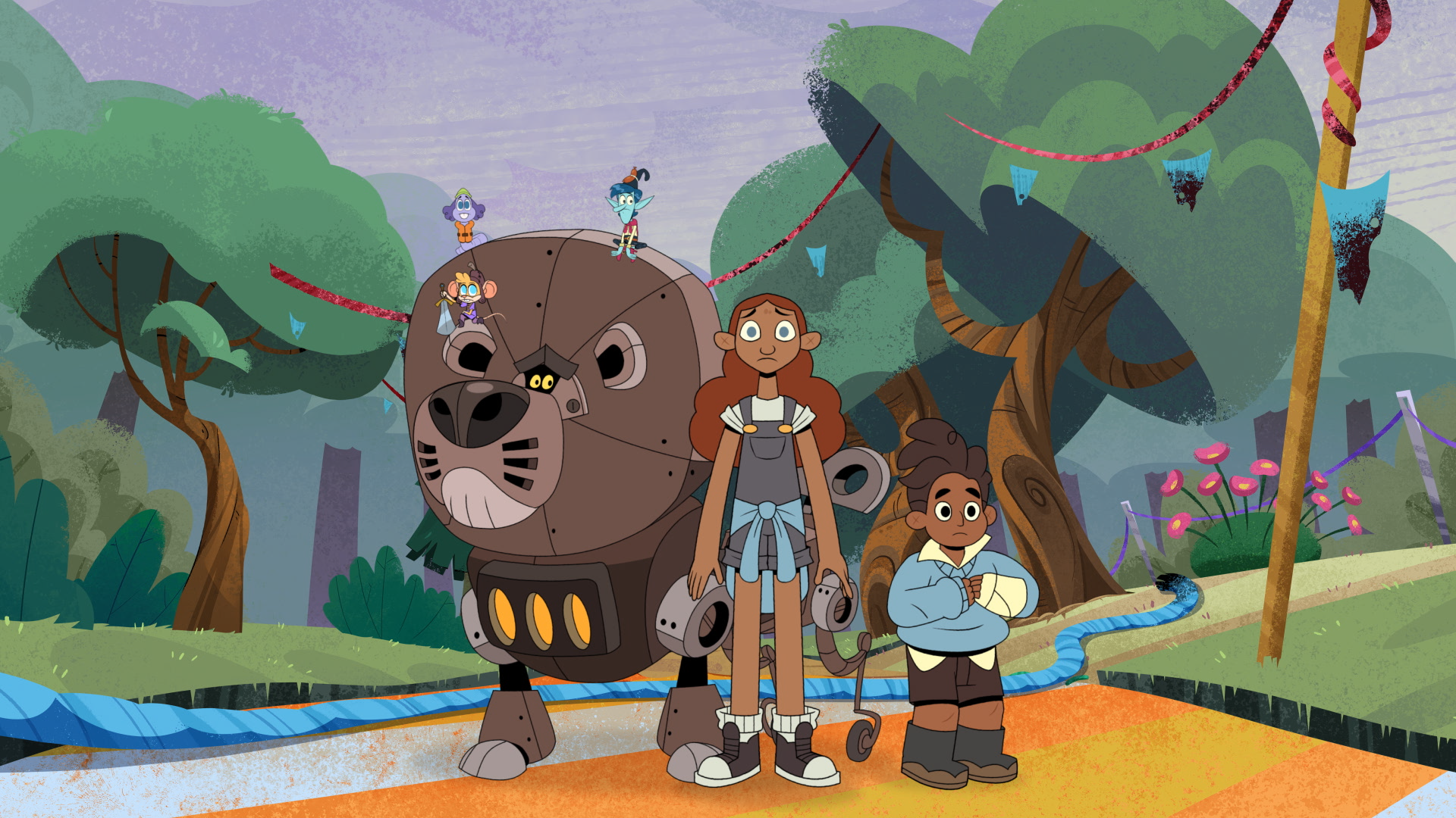The kids meet Binklebonk; a paranoid Tree Goblin struggling with local trouser robbers, Rusty; a water-intolerant mechanical lion, Mudwiggle; the world's strongest worm-slash-ferry operator, and Dinglemouse; former banana-turned-swashbuckling mouse. The gang travel with Tim & Rose through many strange places, including a field of dangerous Confusalilies, the foggy, froggy Fwomp Swamp and over the Bearded Mountain to face off with the “horridible” witch terrorising the valley - Badjelly.